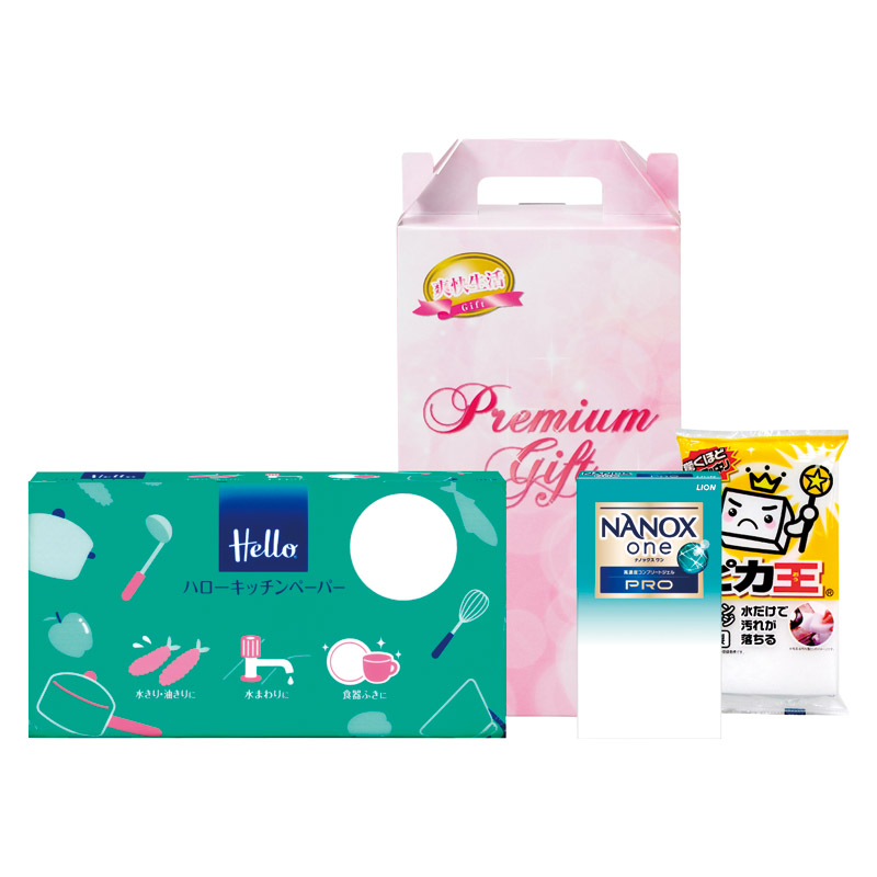 【内容】 ライオンナノックスワンプロ(2P)、ハローキッチンペーパー(70枚)、ピカ王ミニ×各1