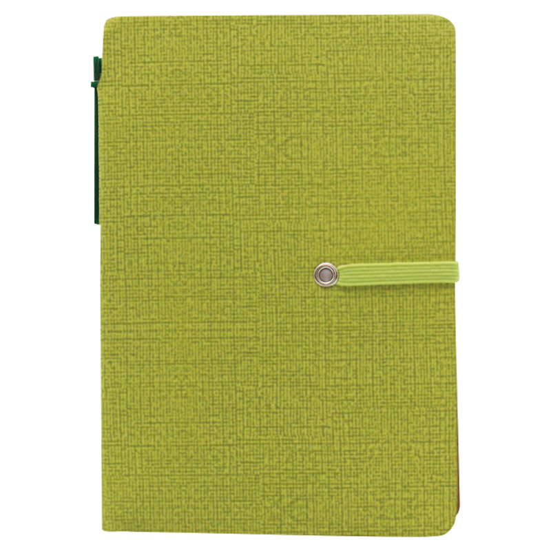 3種類の付箋、ノート、ボールペンがセットされた実用的なノートスタイルブック。 手触り感が良いPVCの表紙と、開かないようしっかりとホールドするゴムバンドがポイントです。