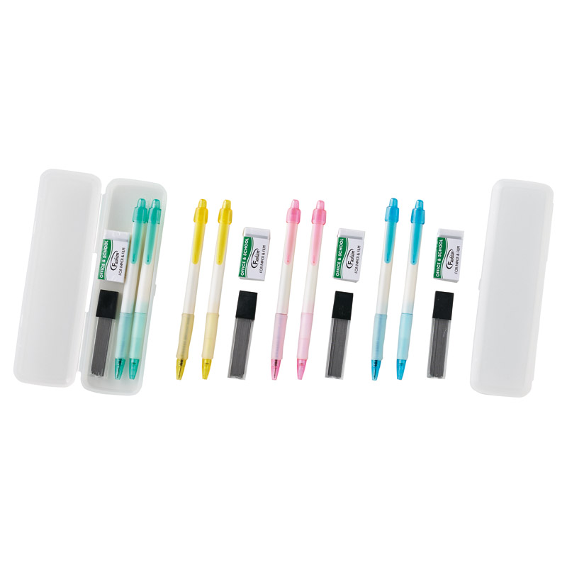 【内容】 環境ケース(約170×50×24mm)、HB替芯(20本)、消しゴム、ボールペン(約直径9×144mm)、シャープペン(約直径9×144mm)×各1