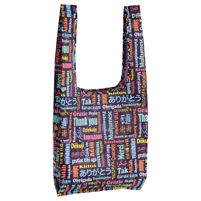 世界の言葉で「ありがとう」「こんにちは」が書かれているエコバッグです。
