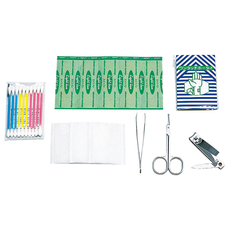【内容】 ケース(約115×76×30mm)、エイトバン(M5枚)、カラーメンボー(10P)、コットンパフ(3枚)、ワンタッチホータイ、爪切り(やすり付き)、毛抜き、ハサミ×各1