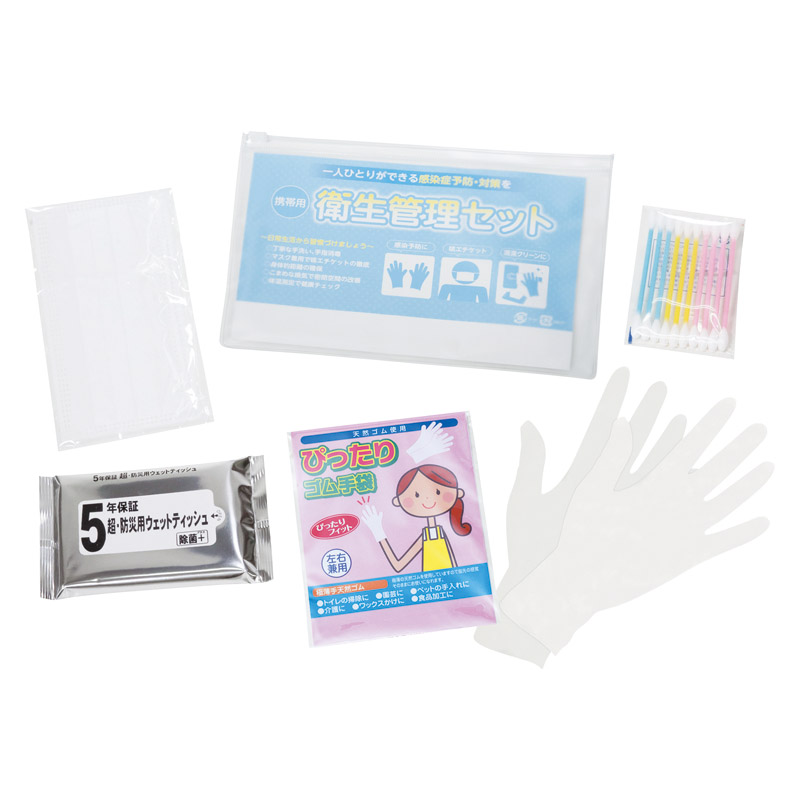 感染症予防に必要な衛生用品をセットしました。 ケース入りなので携帯でき衛生的です。