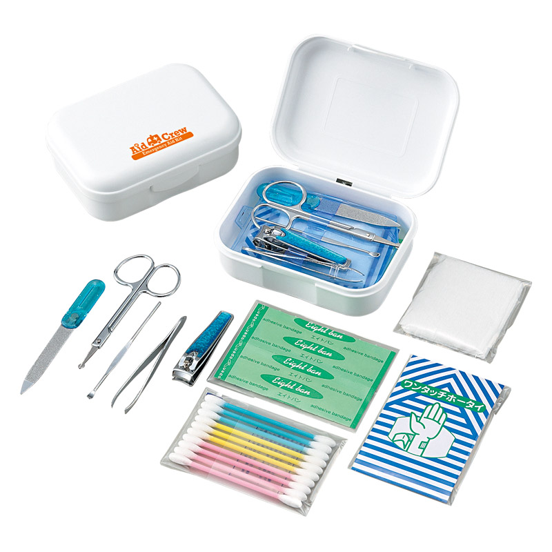 【内容】 専用ケース(約80×110×40mm)、爪切り、エチケットハサミ、耳かき、毛抜き兼ピンセット、爪ヤスリ、ワンタッチ包帯、コットンパフ(3枚)、キズテープ(M3枚)、カラー綿棒(10本)×各1