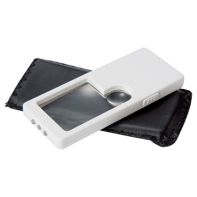 外側ライトで懐中電灯にもなるルーペ!レンズ側ライトで明るくはっきりと。 携帯に便利なポーチ付き。