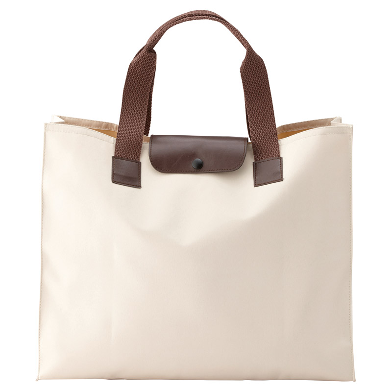 コンパクトに収納できるしっかりとした作りのトートバッグです。 折りたたんでボタンで留めるだけのカンタン収納。