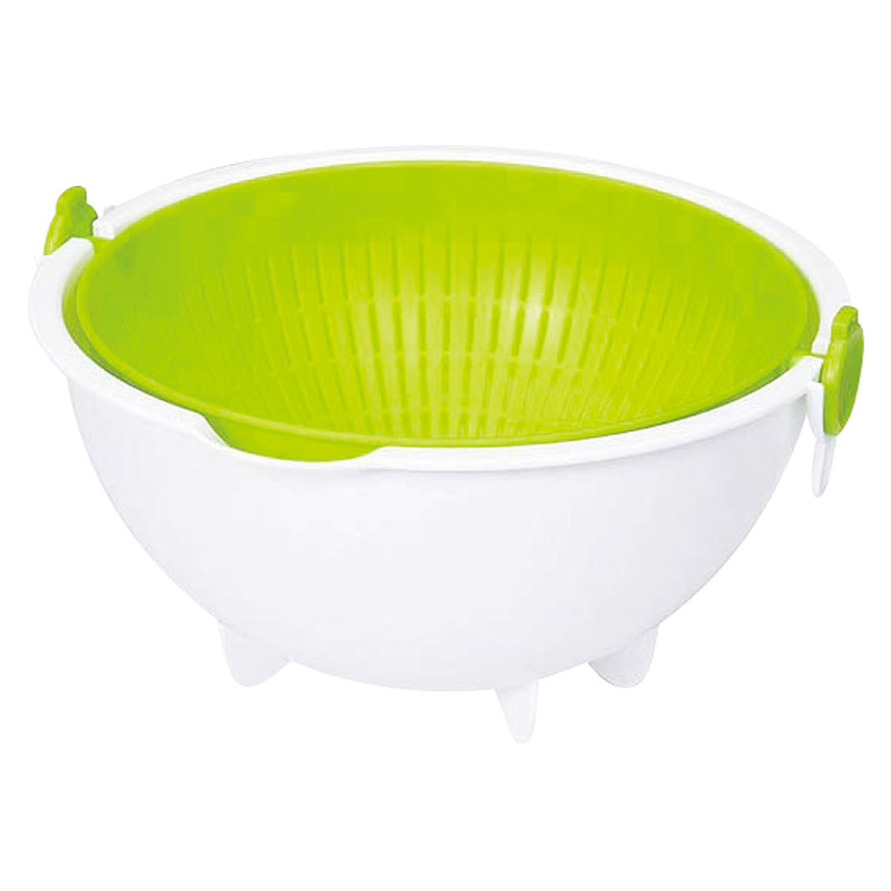 ザルとボウルが一体化。 ボウルの中でザルがクルンと回転して簡単に水切りできます。 ボウルをザルにかぶせて振れば、葉物野菜などの水切りにも便利です。 麺、パスタの湯切りもできます。 耐熱温度:120度。