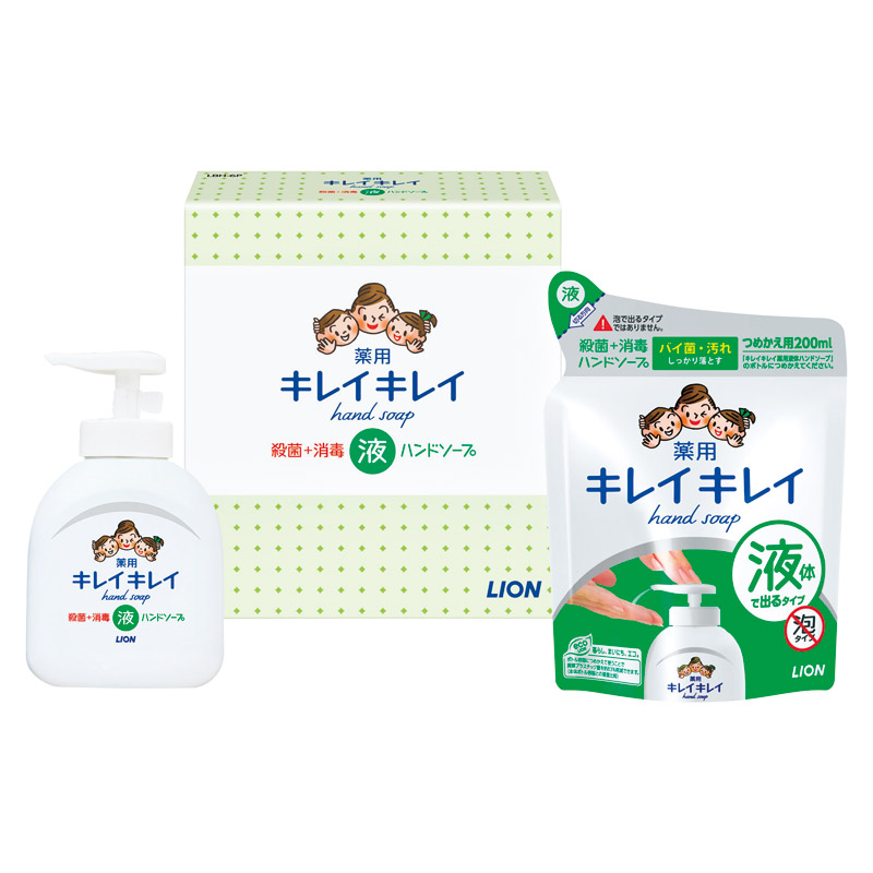 【内容】 キレイキレイ薬用液体ハンドソープ(約250ml)、キレイキレイ薬用液体ハンドソープ詰め替え(約200ml)×各1