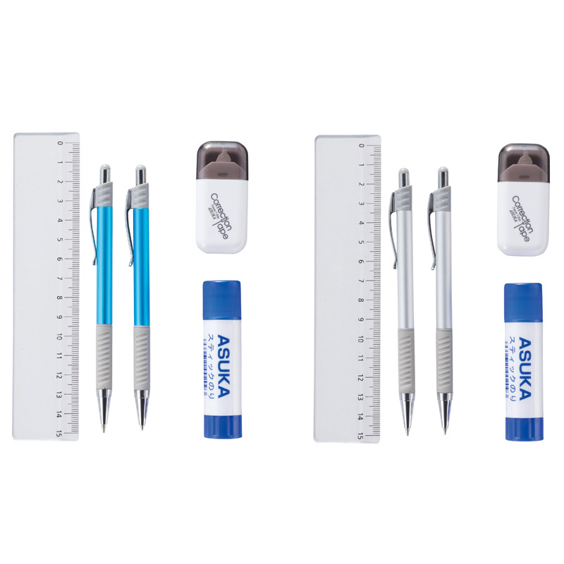 【内容】 ボールペン(約直径8. 2×132mm)、シャープペン(約直径8. 2×132mm)、修正テープ、スティック糊、定規×各1