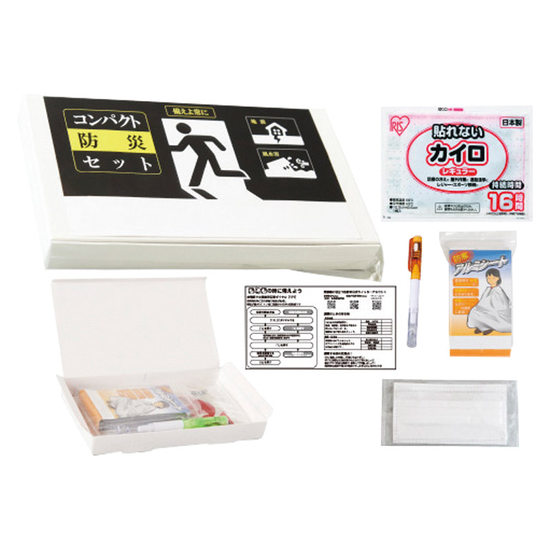 【内容】 ホイッスル付きライトペン、アルミシート、個包装不織布マスク、カイロ、防災の手引き×各1