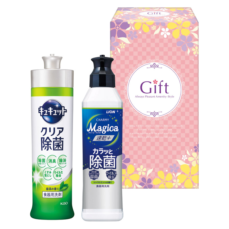 【内容】 ライオンチャーミーマジカ速乾プラスカラッと除菌(約220ml)、花王キュキュットクリア除菌(約240ml)×各1