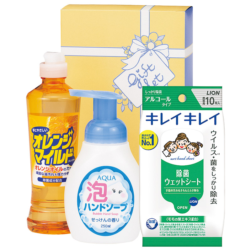 【内容】 オレンジマイルドコンパクト(約270ml)、アクア泡ハンドソープ(約250ml)、ライオンキレイキレイお手ふきウエットシートアルコールタイプ(10枚入)×各1