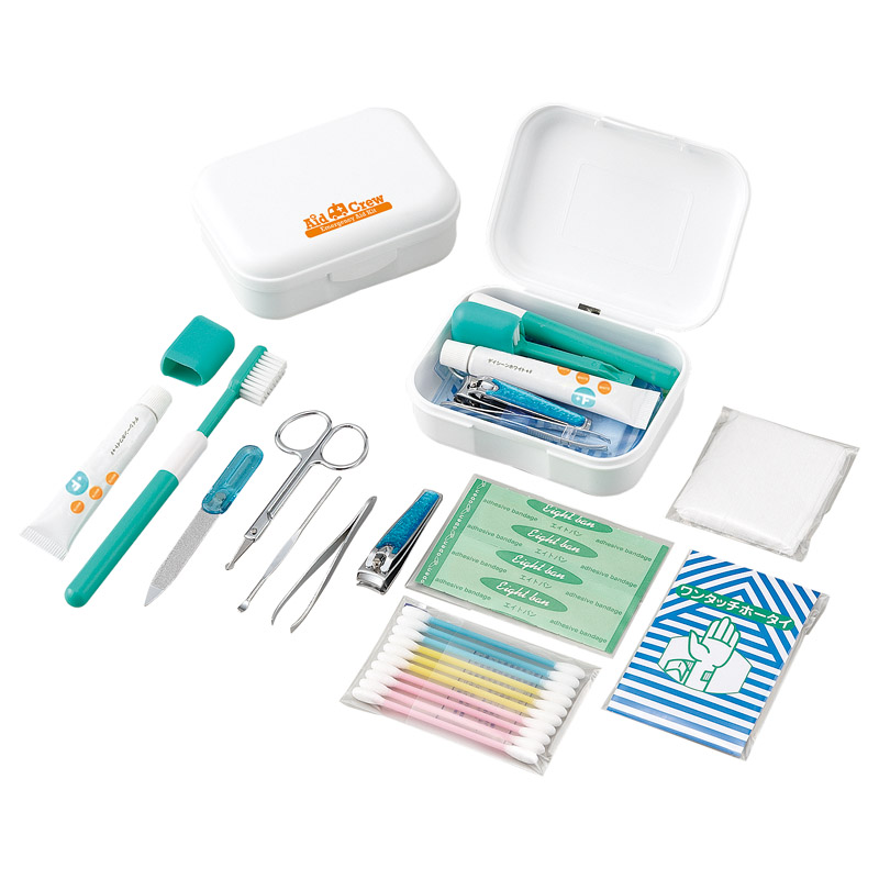 【内容】 専用ケース(約80×110×40mm)、爪切り、エチケットハサミ、耳かき、毛抜き兼ピンセット、爪ヤスリ、ワンタッチ包帯、ハブラシ(カバー付)、ハミガキ粉、コットンパフ(3枚)、キズテープ(M3枚)、カラー綿棒(10本)×各1