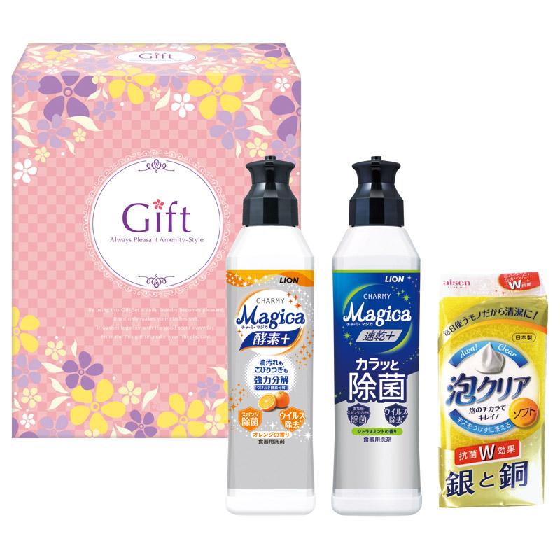 【内容】 ライオンチャーミーマジカ速乾プラスカラッと除菌(約220ml)、ライオンチャーミーマジカ酵素プラス(約220ml)、泡クリアスポンジ×各1