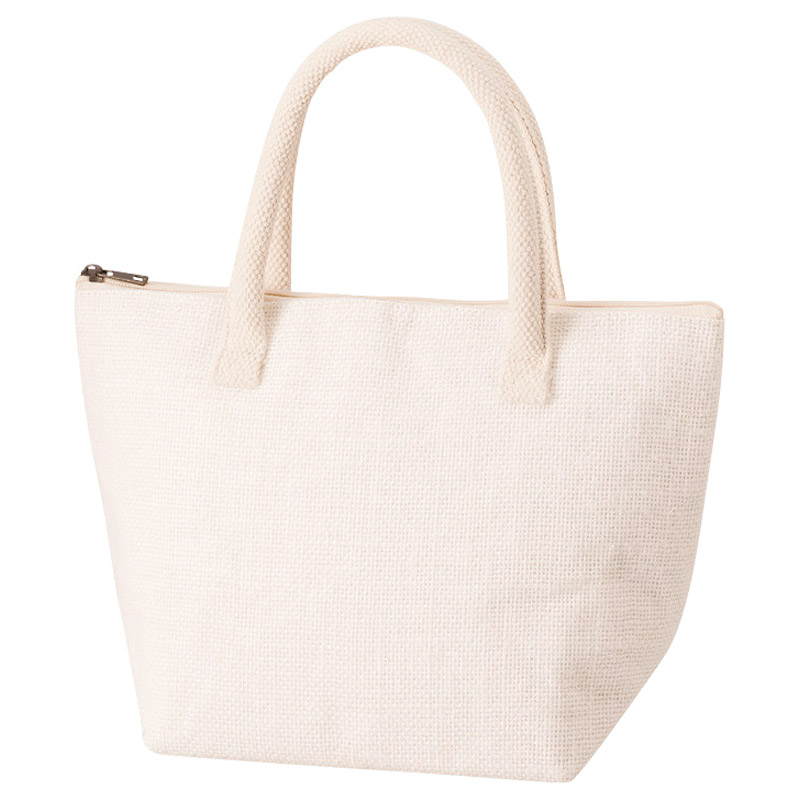 ジュート素材の保冷バッグです。 舟形形状がポイントで、外ハンドルにすることでデザイン性をプラスしています。