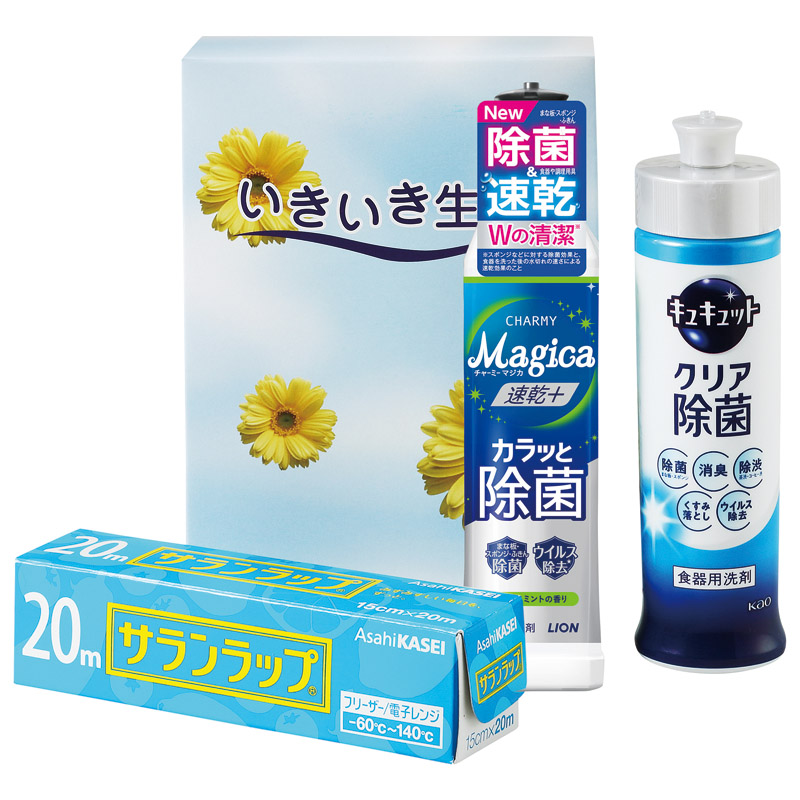 【内容】 花王キュキュットクリア除菌(約240ml)、ライオンチャーミーマジカ速乾プラスカラッと除菌(約220ml)、サランラップ(15cm×20m)×各1