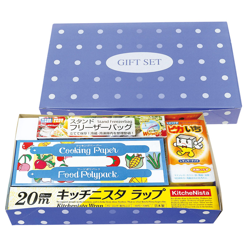 【内容】 キッチニスタラップ(30cm×20m)、スタンドフリーザーバッグ(5枚)、クッキングペアーセット(キッチンペーパー、ポリ袋各10枚)、ピカいち(メラミンスポンジ)×各1