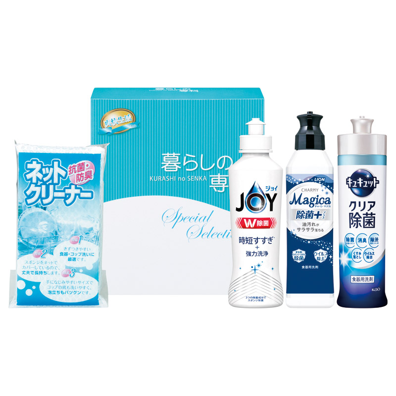 【内容】 P&G除菌ジョイコンパクト(約170ml)、ライオンチャーミーマジカ除菌プラス(約220ml)、花王キュキュットクリア除菌(約240ml)、ネットクリーナー(1P)×各1