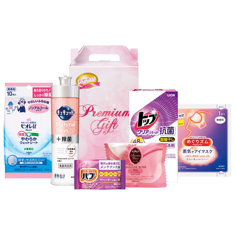 【内容】 花王キュキュット(約240ml)、花王ビオレu除菌やわらかウエットシートノンアルコール(10枚)、花王めぐりズム蒸気でホットアイマスク無香料(1枚)、花王バブラベンダー、ライオントップクリアリキッド抗菌(2P)、アロマデュウゲストソープ(約35g)×各1
