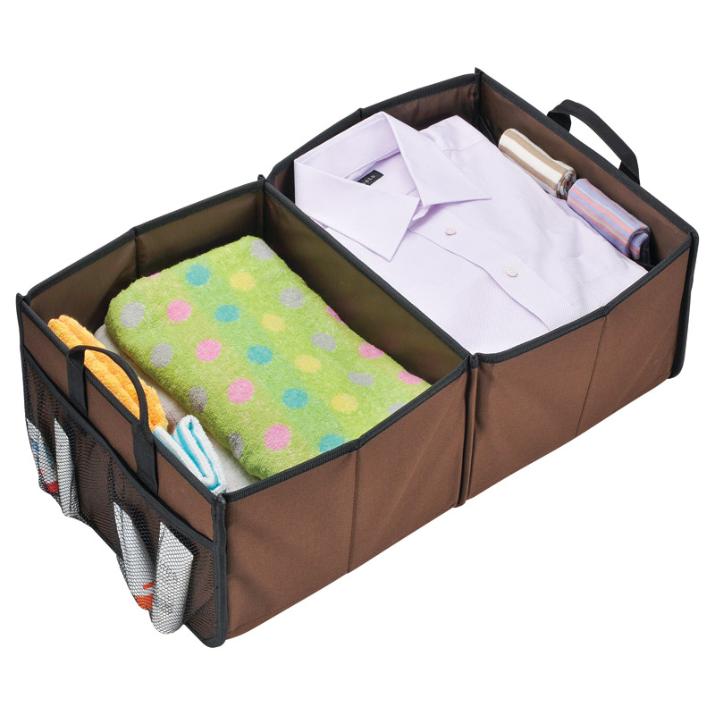 折りたたみ式の収納ボックス。 小物の収納にも役立つネット付。 使わない時にはコンパクトに畳むことができ、使用時には開いて底敷きをセットするだけの簡単組み立て設計。