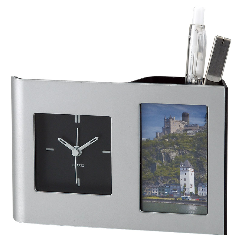 洗練されたモノトーンデザインの時計付ペンスタンドです。 フォトフレームも付いていて、デスク回りを素敵に飾ります。