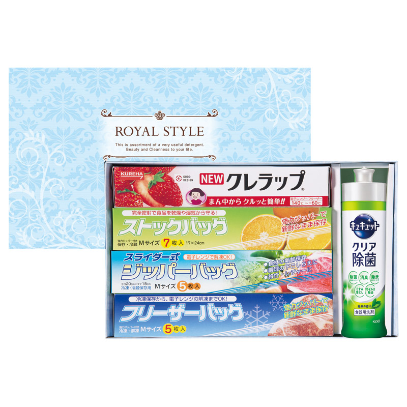 【内容】 クレラップ(22cm×10m)、ストックバッグ(M7枚)、フリーザーバッグ(M5枚)、ジッパーバッグ(M5枚)、花王キュキュットクリア除菌(約240ml)×各1