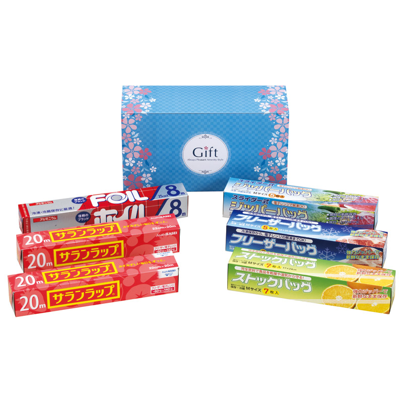 【内容】 サランラップ(22cm×20m)×2、ストックバッグ(M7枚)、フリーザーバッグ(M5枚)、ジッパーバッグ(M5枚)、アルミホイル(25cm×8m)×各1