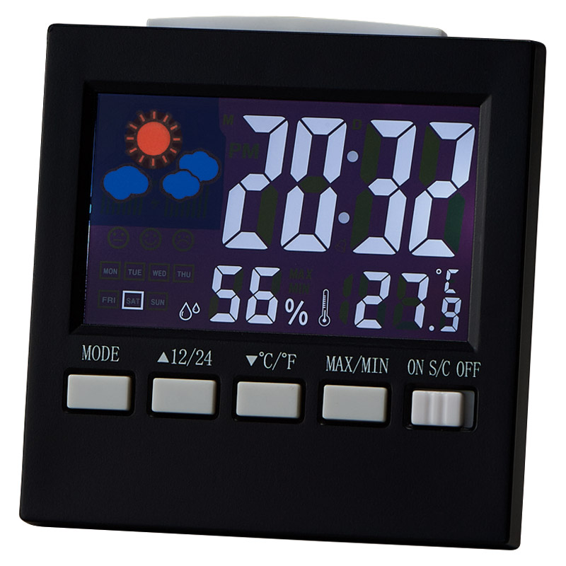 天気予報マークがカラーになっているので分かりやすくインテリアとしてもお洒落です。 時計、アラーム、スヌーズ、カレンダー、温度計、湿度計、天気予報、バックライト、音振動センサー。