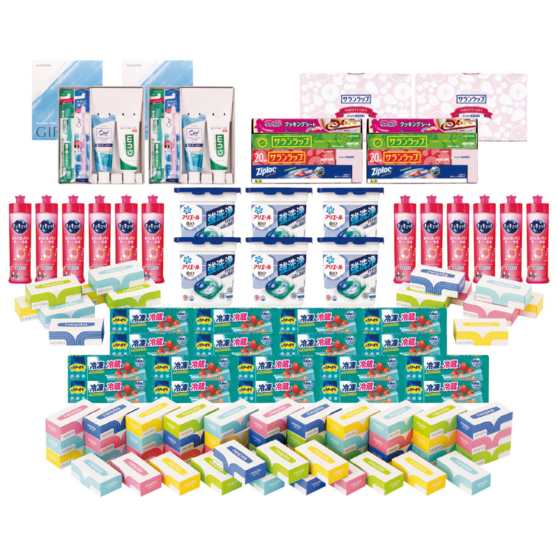 【内容】 1等/サンスタースタンダードセット×2、2等/旭化成サランラップバラエティ10×2、3等/P&Gアリエールジェルボール×6、4等/花王キュキュット(約240ml)×12、5等/ライオンリード冷凍も冷蔵も新鮮保存バッグS3枚×18、6等/ネピアミニティッシュ(1P)×60、付属品:抽選箱×1、くじ×100、くじ明細書×1、A3ポスター×1